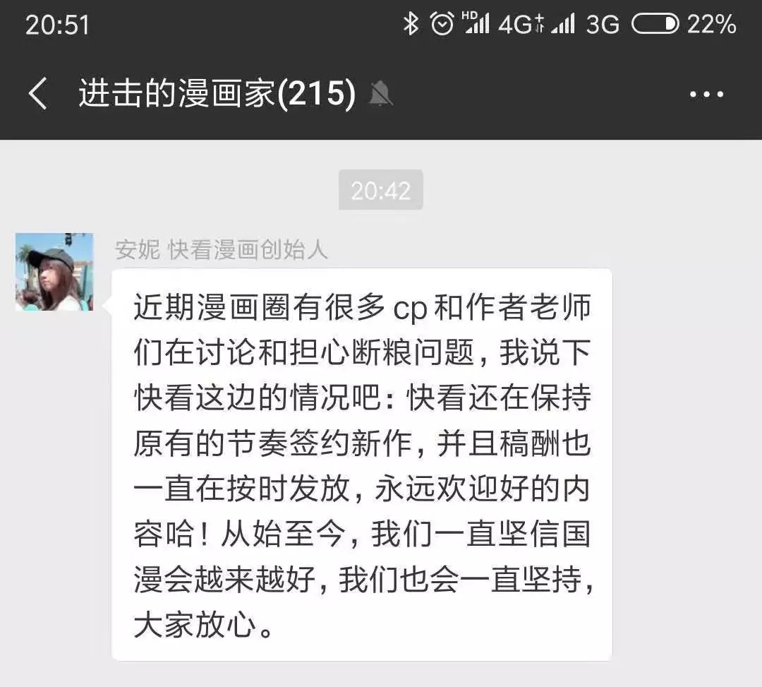 10月底麻辣娱投(id:malayutou001)记者所在的多个漫画产业相关群里,来自快看漫画创始人陈安妮的微信截图传播开来。