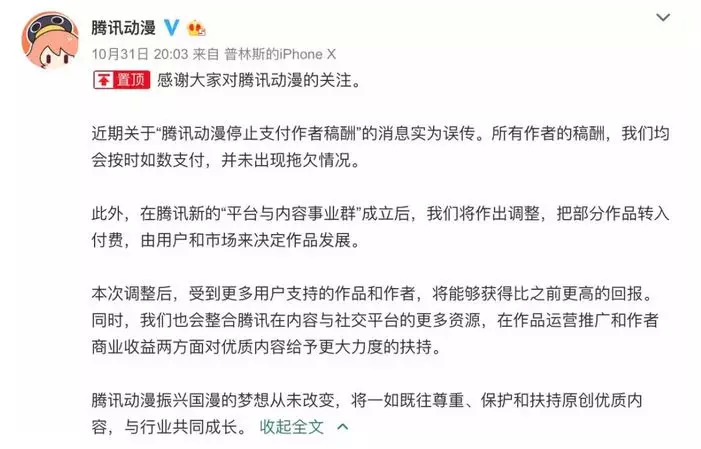 10月31日,腾讯动漫官博针对“停止支付作者稿费”的消息发布回应称,“在腾讯新的“平台与内容事业群”成立后,我们将作出调整,把部分作品转入付费,由用户和市场来决定作品发展。”