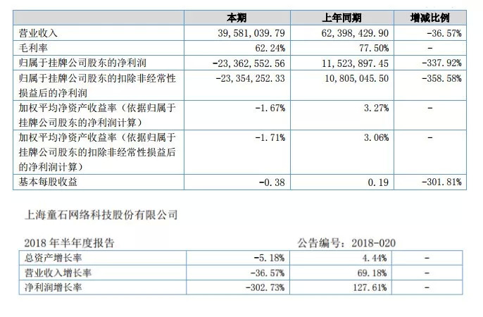 童石网络财报显示,2018年6月30日,公司资产总额为 376,734,648.14 元,比上年末增加了-5.18%,负债总额为 38,660,501.15元,比上年末增加了 7.74%,归属于挂牌公司股东净资产为 337,592,119.75 元,比上年末下降了6.47%。2018年上半年实现经营收入 39,581,039.79 元,比去年同期下降了36.57%;实现归属于挂牌公司股东的净利润-23,362,552.56 元,比去年下降了302.73%。