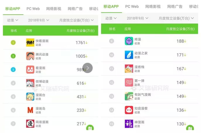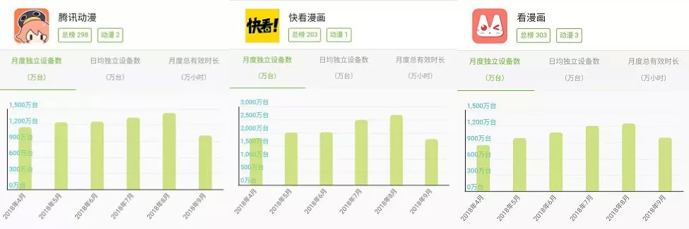 从多个漫画平台来看,2018年9月月度独立设备数均呈现下降状态。