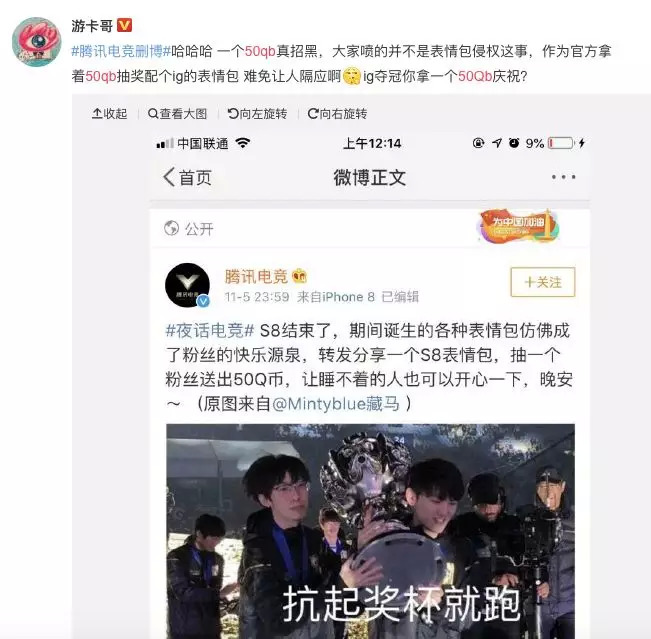 当然,此事据说有一个背景:“王思聪这么做,可能是被逼的,本来是官方策划IG夺冠热门话题的抽奖,结果‘50Q币’抽一名,粉丝都怒了,找王思聪抱怨,王思聪就搞了这个。”
