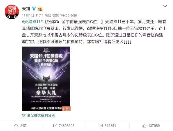 所以,天猫很机灵地赶紧又复制了一套中国锦鲤的微博玩法,在11月6日上午11点11分,也就是和王思聪微博撒币的同一天,策划了一个“祝你Get全宇宙最强表白C位!”