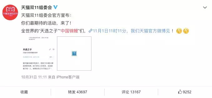 当然,也是天猫双十一的最大预热,大叔甚至觉得,估计阿里自己的人都没有预计到中国锦鲤会有如此之火,不然肯定不会放在一个月前的预热上,多浪费啊。