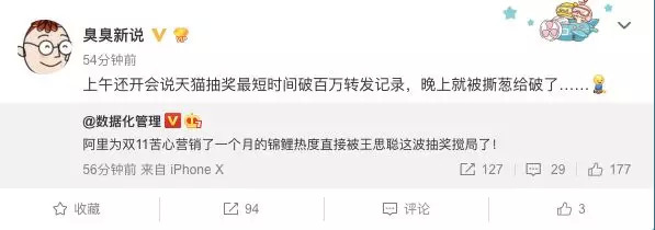 虽然在转发量的绝对数值上,目前来看,@天猫 遥遥领先 @王思聪,但却在效率上,已经被王思聪赶超。认证信息为“电商人”的微博大号@臭臭新说 爆料称:“上午还开会说天猫抽奖最短时间破百万转发记录,晚上就被撕葱给破了。”