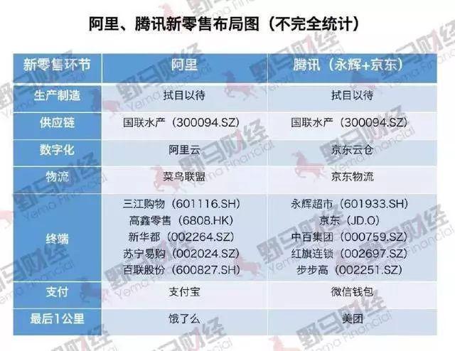 阿里阵营拥有三江购物、盒马鲜生、高鑫零售等,腾讯阵营包括永辉超市、小象生鲜、中百集团等。