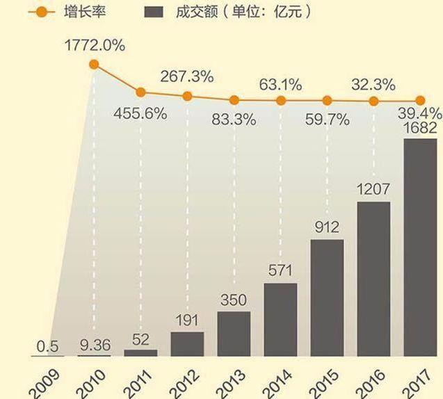 1)增长抵达天花板的问题,今年是双十一十周年,回顾历年来双十一的交易额,其交易额数字在不断增大,但趋势却逐年放缓。