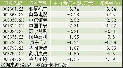 全天,沪深两市共计18只个股主力资金净流出额超1亿元。亚夏汽车(002607.SZ)、奥马电器(002668.SZ)、中信证券(600030.SH)成为今日主力抛售力度最大的三只个股,其净流出额分别为3.74亿元、3.28亿元、2.52亿元。