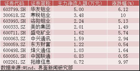 剔除尚未开板的新股,全天沪深两市主力净流入额超过1亿元的个股共计8只。钴概念强势走红,成为今日拉升大盘的一股力量。华友钴业(603799.SH)、寒锐钴业(300618.SZ)、洛阳钼业(603993.SH)等钴概念股获得主力资金抢筹,分别实现净流入5.00亿元、3.48亿元、2.24亿元。5G概念盘中崛起,拓维信息(002261.SZ)封板涨停,净流入0.72亿元。中兴通讯(000063.SZ)、烽火通信(600498.SH)、中国联通(600050.SH)分别净流入1.59亿元、1.03亿元、0.83亿元。