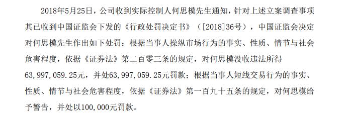 今年5月,因操纵证券市场,证监会决定没收何思模违法所得6399.71万元,罚款6399.71万元。对何思模短线交易的行为,证监会给予警告,并顶格处罚10万元。