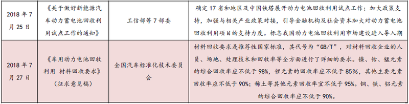 7月25日,工信部、科技部等七部委联合发布了《关于做好新能源汽车动力蓄电池回收利用试点工作的通知》,通知明确规定,将推动汽车生产企业落实生产者责任延伸制度,建立回收服务网点,充分发挥现有售后服务渠道优势,与电池生产、报废汽车回收拆解及综合利用企业合作构建区域化回收利用体系。做好动力蓄电池回收利用相关信息公开,采取回购、以旧换新等措施促进动力蓄电池回收。