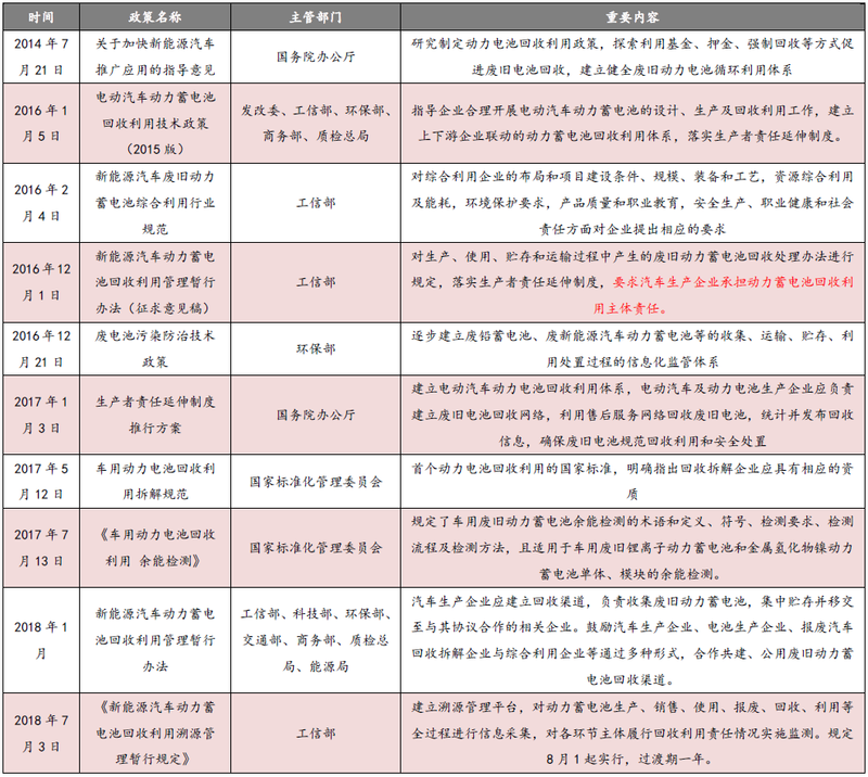 针对如此大规模报废的动力电池,国家高度重视,政策也密集出台,不断出台动力电池回收政策,完善回收体系建设。早在2016 年 12 月,工信部便发布《新能源汽车动力蓄电池回收利用管理暂行办法》(征求意见稿),明确了汽车生产企业承担动力蓄电池回收利用主体责任。2018 年 3 月 2 日,工业和信息化部、科技部、环境保护部、交通运输部、商 务 部、质检总局、能源局联合发布《关于组织开展新能源汽车动力蓄电池回收利用试点工作的通知》,要求构建回收利用体系,探索多样化商业模式,鼓励产业链上下游企业进行有效的信息沟通和密切合作,以满足市场需求和资源利用价值最大化为目标,建立稳定的商业运营模式,推动形成动力蓄电池梯次利用规模化市场。