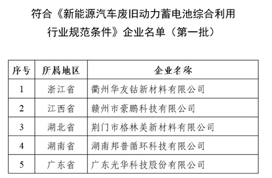 7月27日,工业和信息化部节能与综合利用司按照《新能源汽车废旧动力蓄电池综合利用行业规范条件》和《新能源汽车废旧蓄电池综合利用行业规范公告管理暂行办法》要求,发布第一批《新能源汽车废旧动力蓄电池综合利用行业规范条件》企业名单。名单中有五家企业,分别是华友钴业、豪鹏科技、格林美、邦普循环和光华科技。