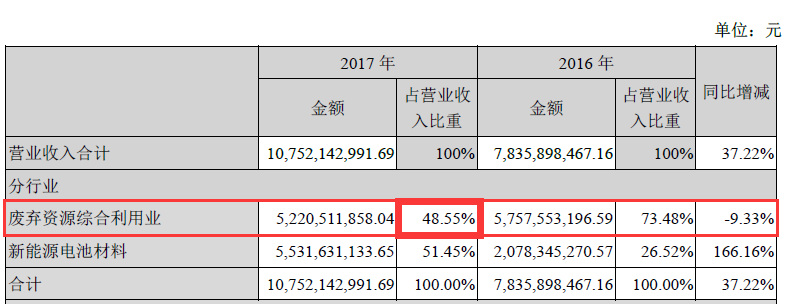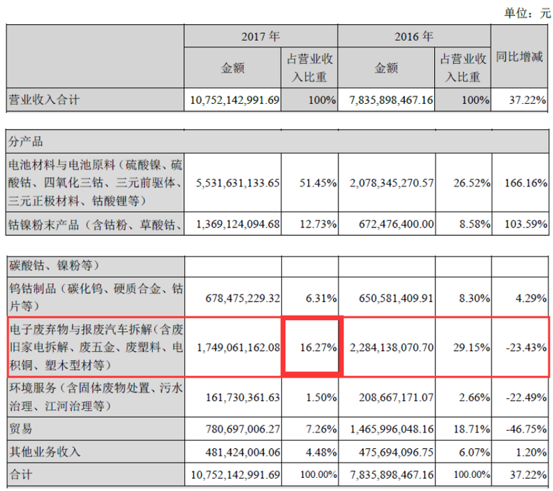 作为主营业务其一便是电池回收的格林美来说,电子废弃物的拆解业务一直是公司重点战略之一,格林美表示将积极探索再生资源料场运营模式,转型升级城市矿山业务。 格林美在国内率先提出“资源有限、循环无限”的产业理念,积极倡导开采“城市矿山”,突破性解决了中国在废旧电池、电子废弃物与报废汽车等典型废弃资源绿色处理与循环利用的关键技术,在湖北、湖南、江西、河南、天津、江苏、浙江、山西和内蒙古等省市和南非德班市建成十六大循环产业园,建成废旧电池与动力电池大循环产业链,钴镍钨资源回收与硬质合金产业链,电子废弃物循环利用产业链,报废汽车综合利用产业链,废渣、废泥、废水循环利用产业链等五大产业链,年处理废弃物总量三百万吨以上。 从格林美2017年营业收入构成中,我们可以看到废弃资源综合利用业占公司总营业收入的48.55%,近乎一半。