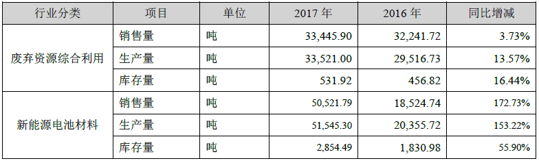 2017年,格林美废弃资源综合利用销售量达3.34万吨,生产量达3.35万吨。