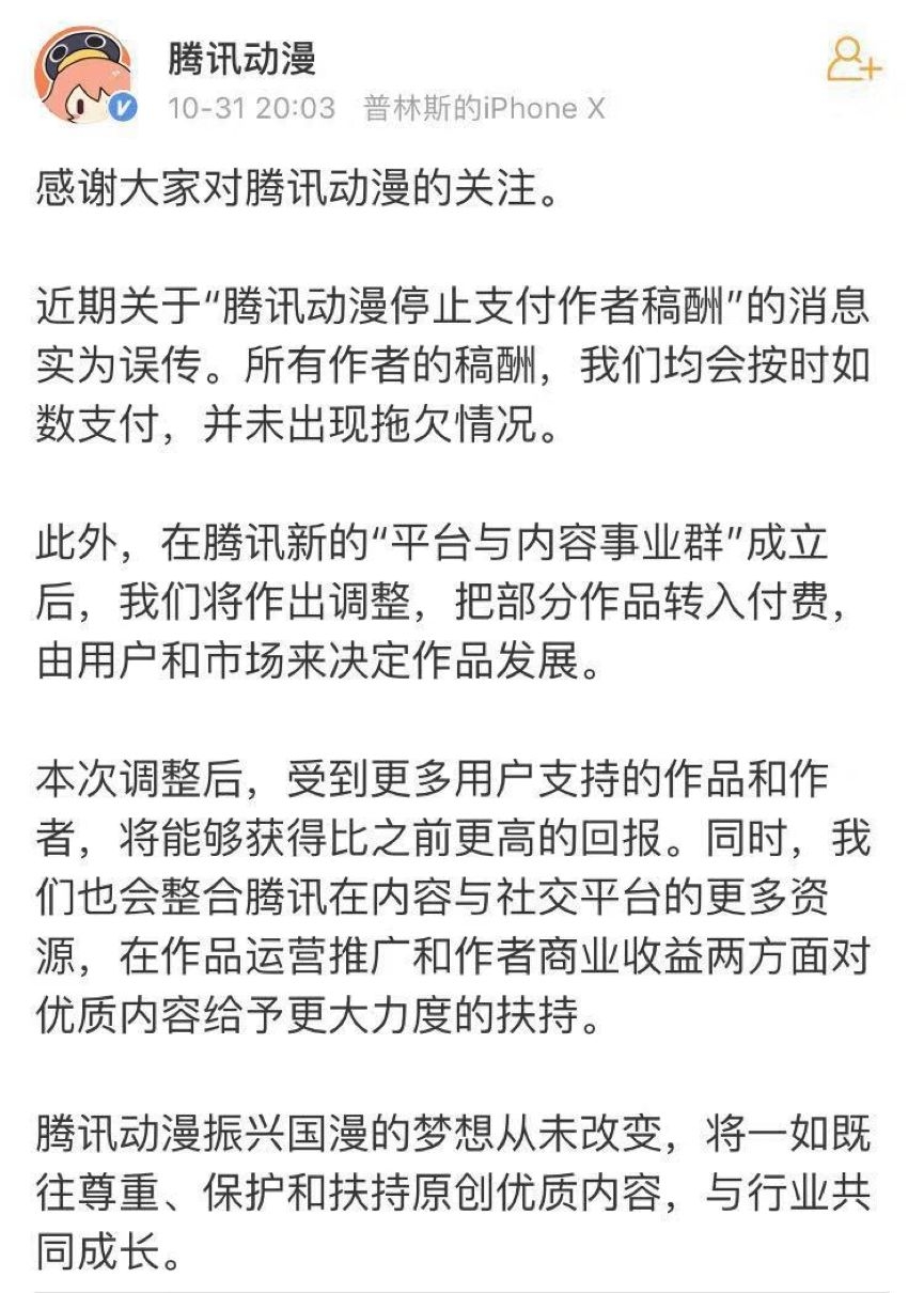 10月底,一张“腾讯动漫停止支付作者稿酬”的截图在网上传播,舆论四起。腾讯动漫官方随后进行澄清,“所有作者的稿酬,我们均会按时如数支付,并未出现拖欠情况”,并表示,腾讯动漫将进行调整,把部分作品转入付费,由用户和市场来决定作品发展,调整之后,收到用户支持的作品将会获得更高的回报。