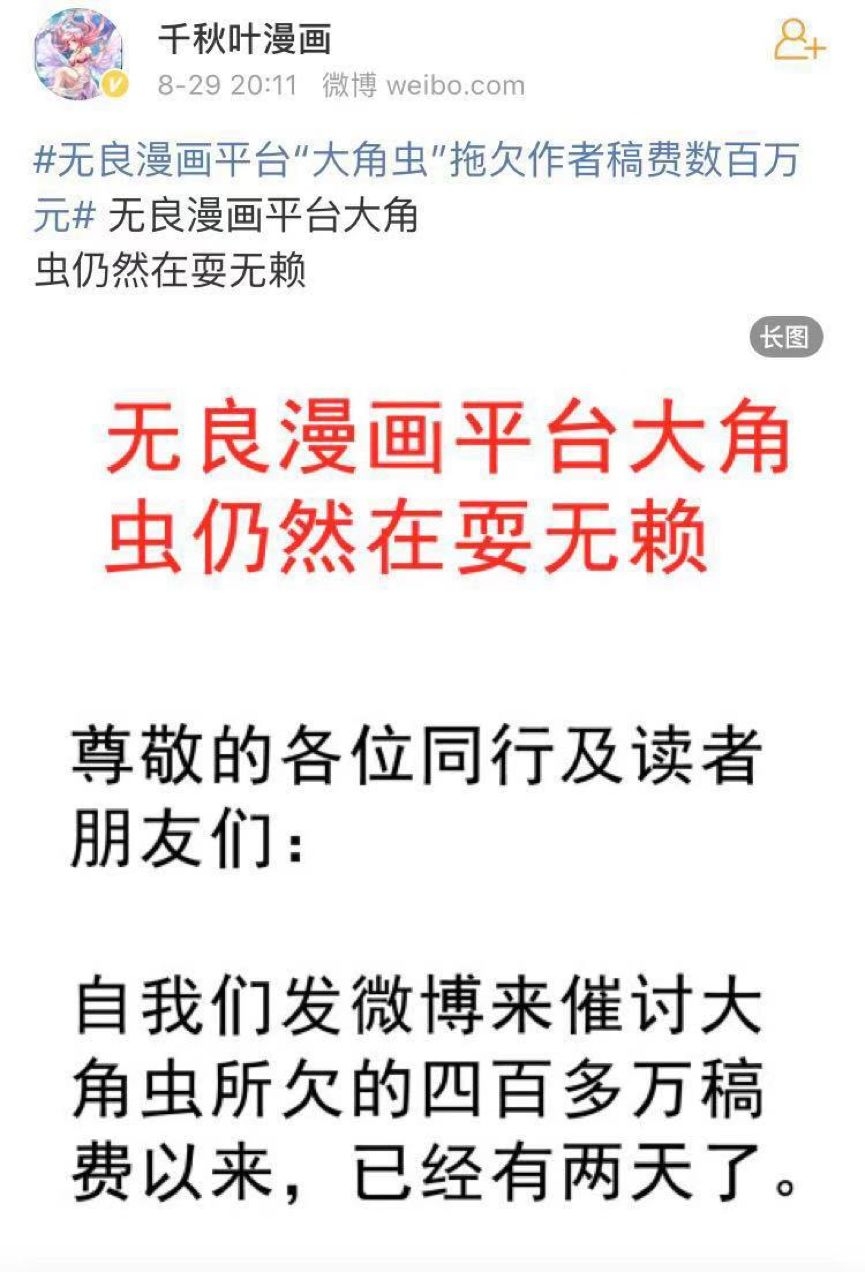 今年8月,千秋叶漫画发布微博称,漫画平台大角虫已累计拖欠作者稿费数百万元。据了解,爆料方是大角虫漫画平台旗下的漫画作者,双方已经合作了三年。然而从2018年1月起,大角虫便开始出现拖欠稿费的情况。据不完全统计,被拖欠稿费的漫画工作室或作者达到46家,总金额超过400万。大角虫漫画的头部漫画作者如《星梦偶像计划》的作者烟头histone、《超有病》的作者孙渣,也都表示自己也有被欠薪的情况。