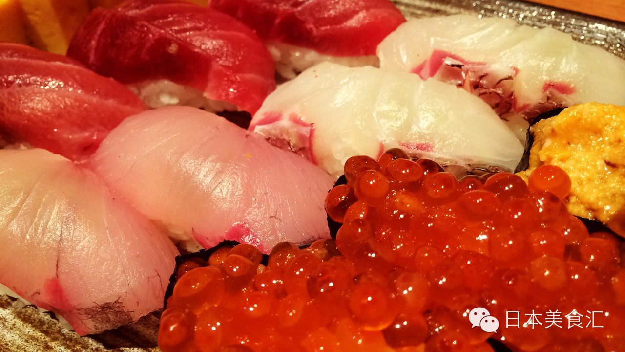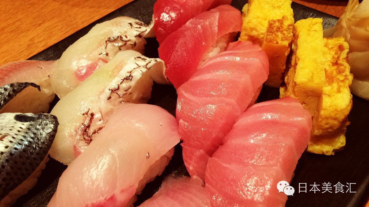 以前在国内吃过的寿司虽然不少,但是餐厅能提供的鱼就那几种:三文鱼、金枪鱼、加吉鱼(鲷鱼)、甜虾、北极贝,屈指可数。在日本可就不一样了,我们人多,朋友本着尽量让大家多吃一些新鲜寿司的原则,一口气点了十几种,端上来我就惊了,真是不带重样的,有很多我根本就没有听说过的鱼和新鲜的吃法,比如鰺鱼搭配着香葱和姜蓉吃,和平常吃的寿司是不同的感觉。