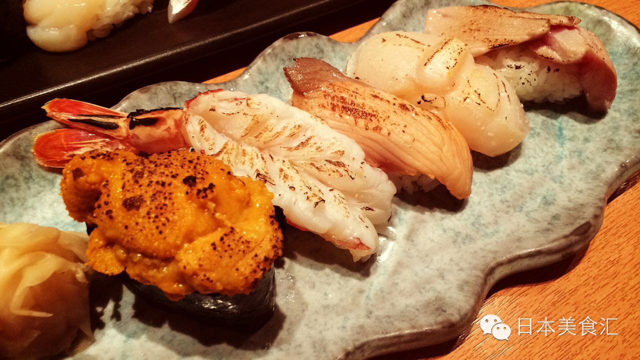 最后上来的是炙り寿司,海胆、三文鱼、扇贝、鲜虾寿司在站上桌前用火枪一燎,美味又有另外一种形式的呈现,燎过的鱼肉依然柔软香甜,但是肉的紧实度略微有点变化,一片鱼肉生熟两种口感,两种鲜香,这种料理的创意很赞。