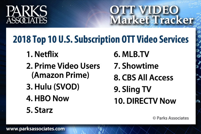 11月7日,市场研究及咨询机构Parks Associates公布了美国OTT视频订阅服务的最新排名,HBO Now和Starz双双跻身前五,仅排在Netflix、亚马逊Prime Video和Hulu之后。