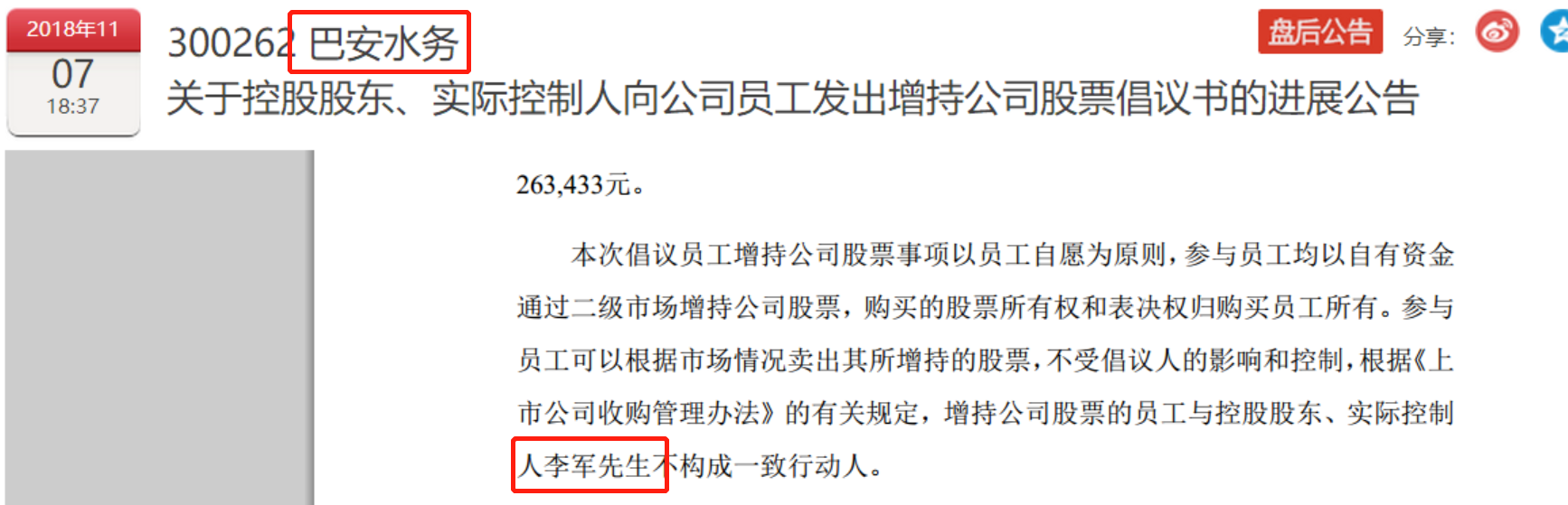 需要指出的是,巴安水务的增持公告中还疑似出现“无脑抄袭”的现象。界面新闻记者注意到,在11月7日巴安水务《关于控股股东、实际控制人向公司员工发出增持公司股票倡议书的进展公告》中,出现了控股股东、实际控制人的名字2次,第一次为张春霖,第二次为李军。