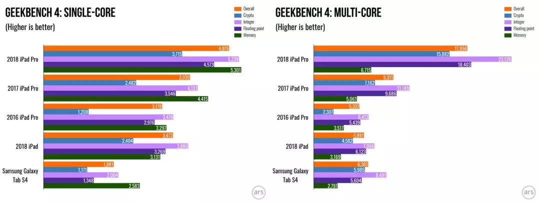 单核/多核,2018iPad Pro与以往iPad及三星Tab S4比较