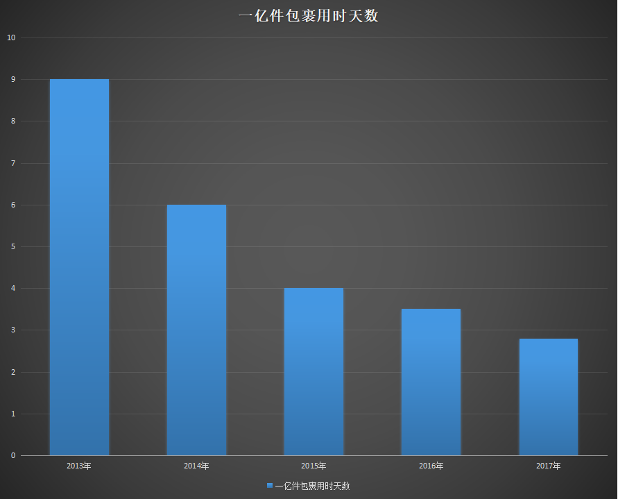 2013年天猫“双十一”包裹在 9 天内签收了超过1亿件,2014年只用了6天,2016年直接缩短到 3.5 天,2017年只用了2.8天,而且第一单签收只用了12分钟。张勇预测2018年“双十一”包裹量将突破10亿。