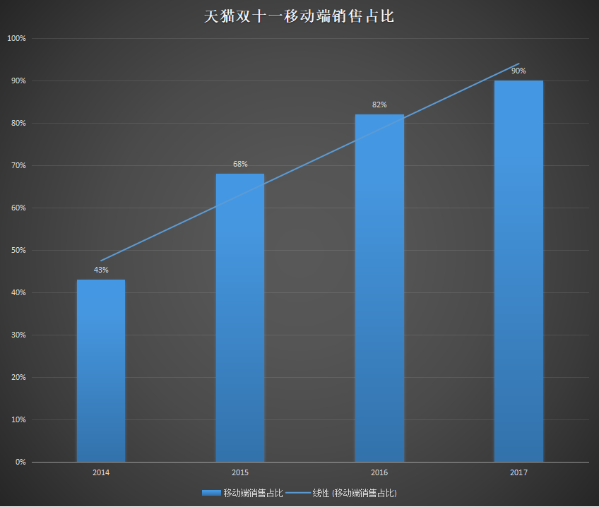 2014年随着iPhone、小米等智能手机的广泛使用,移动互联网开始席卷PC互联网。阿里在意识到移动端的重要性后,做的一件事就是全力拥抱移动互联网,在“双十一”中更是体现明显。