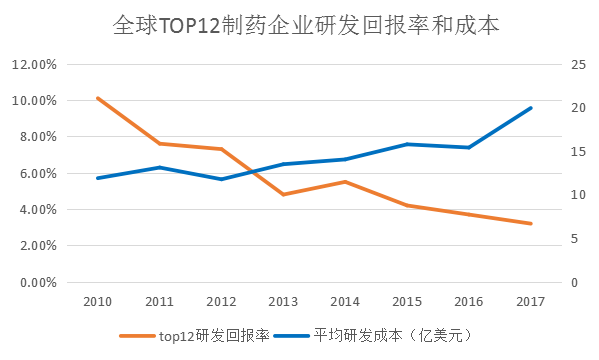 根据德勤的数据统计,2017年top12制药企业在研发上的投资回报率仅有3.2%,相比2010年的10.1%显著下降。其原因与创新药的研发成本持续攀升不无关系,新药研发成本从2010年的11.88亿美元增加到2017年的19.92亿美元,比2016年增长了29.4%。越来越多的公司通过并购快速获得产品资源。