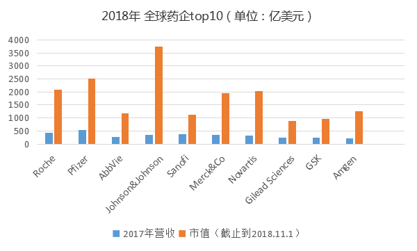 根据知名医药咨询公司Igeahub近日发布的《2018年全球制药企业TOP10》,全球十大制药公司的销售额合计约占全球市场份额的40%。前十大医药公司中,除了来自瑞士的罗氏(F. Hoffmann-La Roche Ltd)和诺华(Novartis),英国的默克公司(Merck & Co.)和葛兰素(GlaxoSmithKline),法国的赛诺菲(Sanofi),其他五个巨头公司均来自美国,辉瑞(Pfizer),艾伯维(AbbVie),强生(Johnson & Johnson), 吉利德(Gilead Sciences),安进(Amgen)。美国占据了全球医药行业的半壁江山。