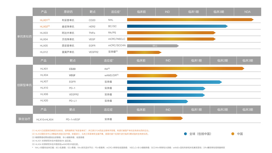 复宏汉霖是复星医药旗下专注于肿瘤和自身免疫疾病的新药研发平台,截止目前,复宏汉霖共计完成12个产品、18项适应症的临床试验申报,其中9个产品已在海内外开展临床试验,4个产品进入临床3期研究,领跑国内单抗生物药行业。