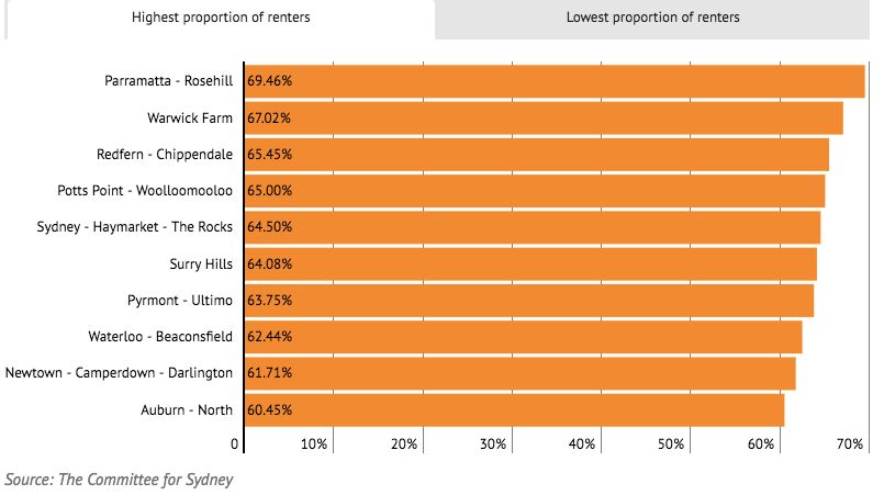 悉尼委员会的报告指出,悉尼最具经济活力的地区,如那些汇集高附加值工作岗位的地区往往就是租客比例最高的地区。