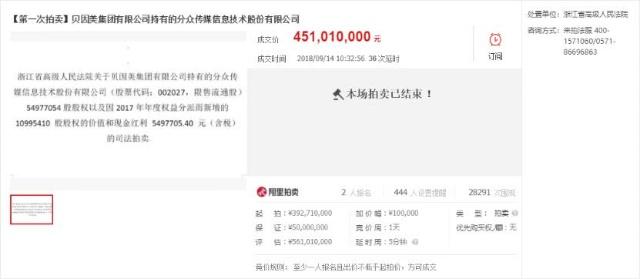 9月中旬,因提供担保的信托贷款违约,浙江省高院将贝因美集团所持分众传媒的约6600万股进行司法拍卖。经过47轮竞价,最终由名为“泊通量化2号私募投资基金”(下称“泊通量化2号”)的用户,以4.51亿元的价格成功竞得。