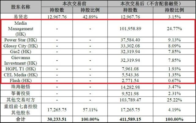 重组预案显示,七喜控股拟以10.46元/股的价格向江南春控制的Media Management(HK)、中信资本的Power Star(HK)、复星国际旗下的Glossy City(HK)、方源资本的Gio2(HK)和凯雷资本旗下的Giovanna(HK)等43家境内外交易对方发行38.14亿股股份。