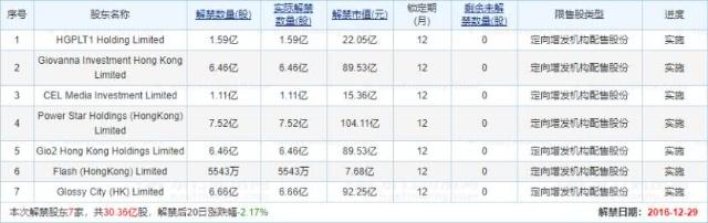 参与分众传媒借壳的7家境外机构股份限售时间为12个月。2016年12月29日,分众传媒迎来第一批限售股解禁潮。中信资本、复星国际等在内的7家境外股东持有34.75%分众传媒股权、合计30.4亿股解禁,但在半年内基本“按兵不动”。
