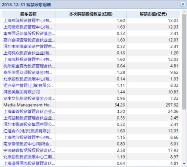 Wind数据显示,2018年12月29日,分众传媒将迎来77.13亿股限售股解禁,规模超过现有69.65亿股流通股,是今年A股第一大解禁股。