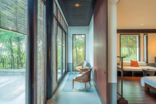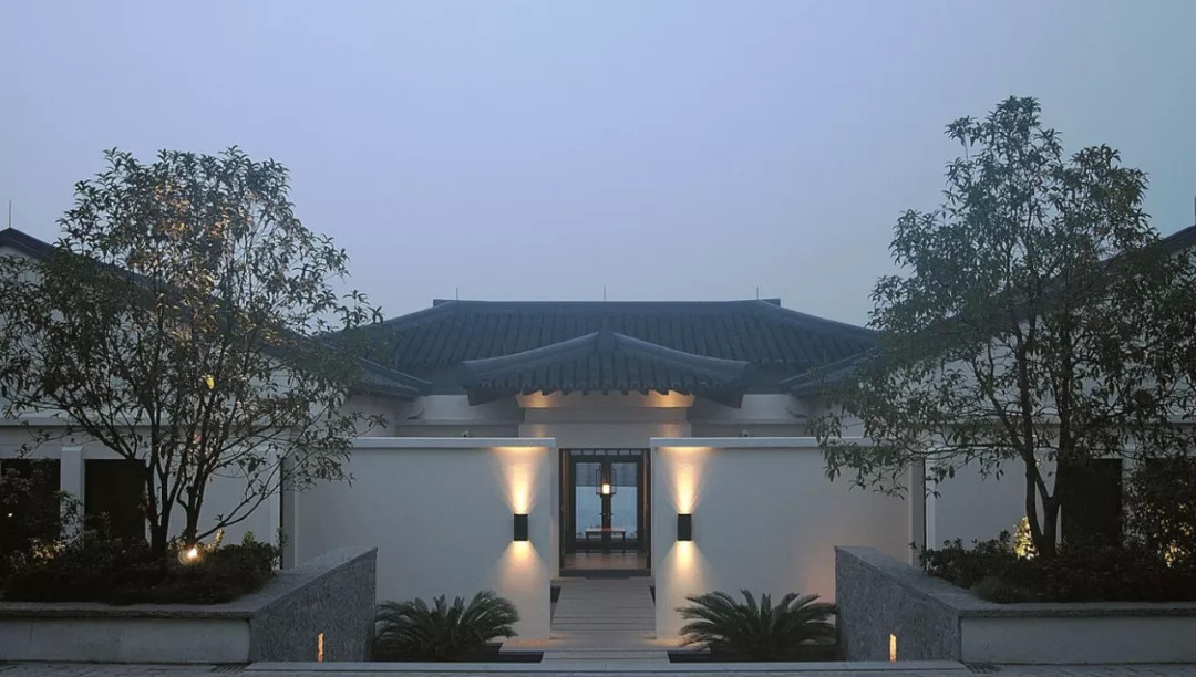 富春山居占地150公顷,依傍着满眼清翠的龙井茶园而建,依照南宋建筑集合而成,白墙青砖灰瓦,水,木,石等元素随处可见,在露台俯瞰波光粼粼的私家湖泊,仿佛身处“富春山居图”画卷之中。