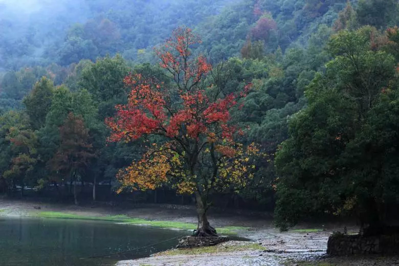 如果你不爱登山可以去富春桃源坐船,这里的红枫虽然不那么密集,但当你坐着游船行驶在江面上,看群山连绵、碧波万顷、山水相依。偶然出现的几颗枫树在一片绿色中显得更加跳脱,有不同于成片枫林的美丽。