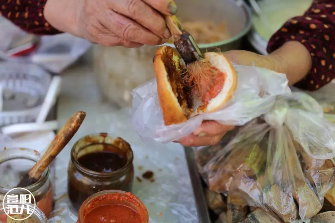 在富阳街头,经常可以见到油费馒头的身影。将酒酿馒头炸至金黄酥脆,趁热剖开,刷上辣酱、甜面酱,夹上几块臭豆腐。酒酿的甜,酱料的辣,臭豆腐独有的“臭”,多种味道叠加,喜欢臭豆腐的绝对一吃上瘾。