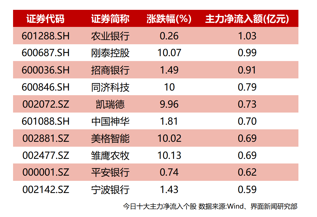 个股表现上看,剔除尚未开板的新股,沪深两市仅有农业银行(601288.SH)主力净流入额超过1亿元。刚泰控股(600687.SH)、招商银行(600036.SH)、同济科技(600846.SH)吸引主力资金净流入分列2、3、4位,分别获0.99亿元、0.91亿元、0.79亿元主力资金流入;美格智能(002881.SZ)实现0.69亿元主力资金净流入涨停;雏鹰农牧(002477.SZ)同样吸引0.69亿元主力资金流入接近涨停。