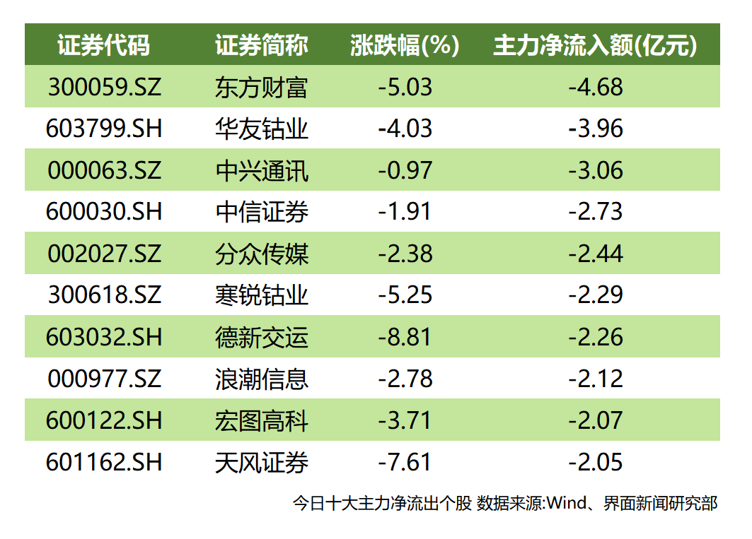 沪深两市共计31只个股主力资金净流出额超1亿元。东方财富(300059.SZ)遭遇4.68亿主力资金净流出;华友钴业(603799.SH)、中兴通讯(000063.SZ)分别遭遇3.96亿元、3.06亿元主力资金流出。