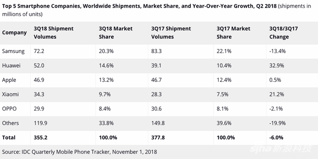 2018年第三季度全球智能手机出货量排名前五的厂商