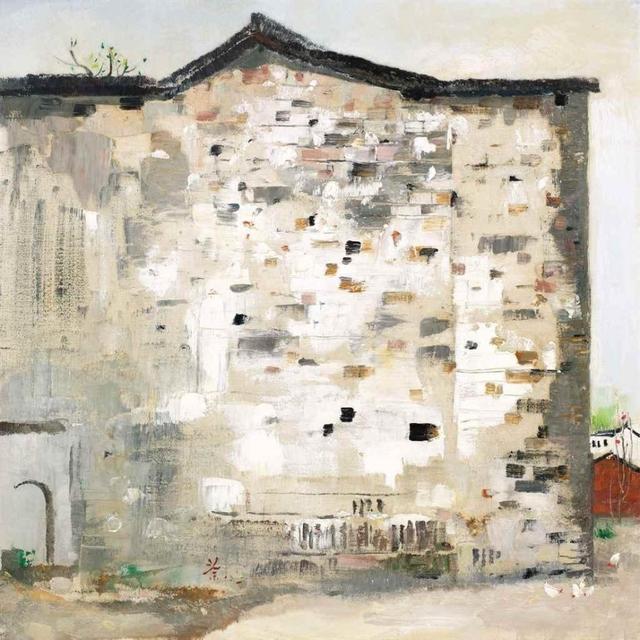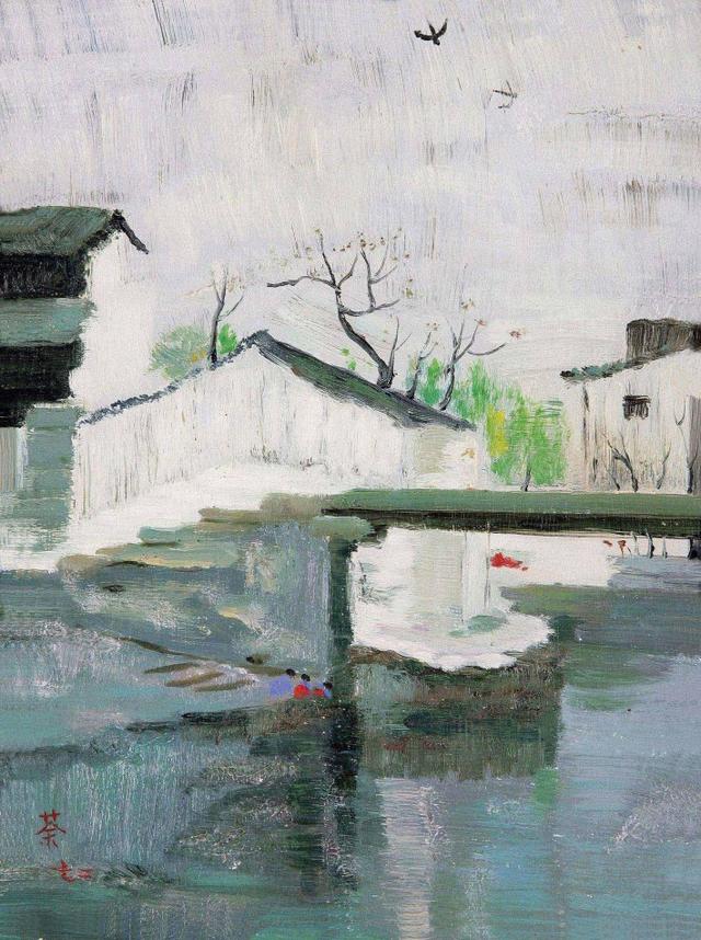 此作写江南水乡景致,画家突出白墙黑瓦的视觉对比,注重形式感的强调,在当时具有先锋意义。