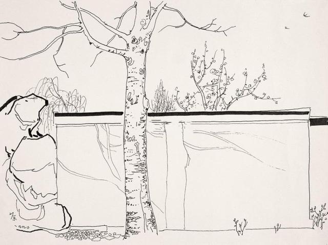 素白的墙,诱惑画家的创作欲望,但却被爬山虎之类的藤线抢先占领了。