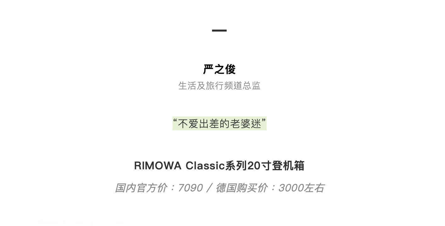 👉拔草理由:工作关系避免不了要出差,家里的旅行箱有点旧了,闹着老婆给我更新一个,要一看就倍儿有面那种(是的,家里钱不归我管)。老婆说只能更新个登机箱,多出短差去吧。大的RIMOWA容易被地勤摔坏,买登机箱就不用烦恼这个问题了,喜欢Classic经典系列,手工皮把手很好看,外观也大气简洁。买好了应该会好好爱惜吧。