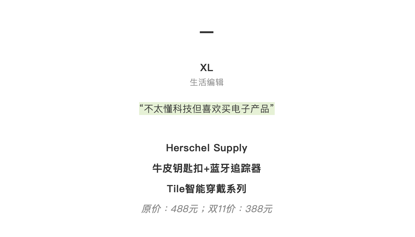 💁拔草理由:Herschel Supply 是一个年轻的背包品牌,以帆布的旅行包袋为主,但这个与智能穿戴设备品牌 Tile 合作的蓝牙追踪器看起来非常有趣。可以让丢三落四的我在旅行时候放心一点,皮革的配饰也有“大人感”,这件产品在我的收藏夹里躺了一段时间了,这次双十一也会在Herschel Supply 的天猫店参与打折,像在对我说,可以买了!