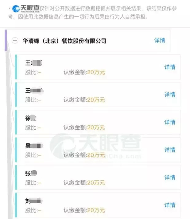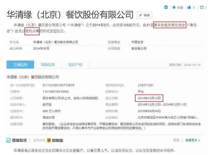 据悉,该公司是华清缘(北京)餐饮股份有限公司,由31名清华总裁发展促进会(“清促会”)会员以股权众筹的形式发起创立。华清缘开业时声势颇大。根据清华总裁发展促进会的官网,2015年1月17日,有超过150名领导、嘉宾、股东和同学参加了开业庆典。