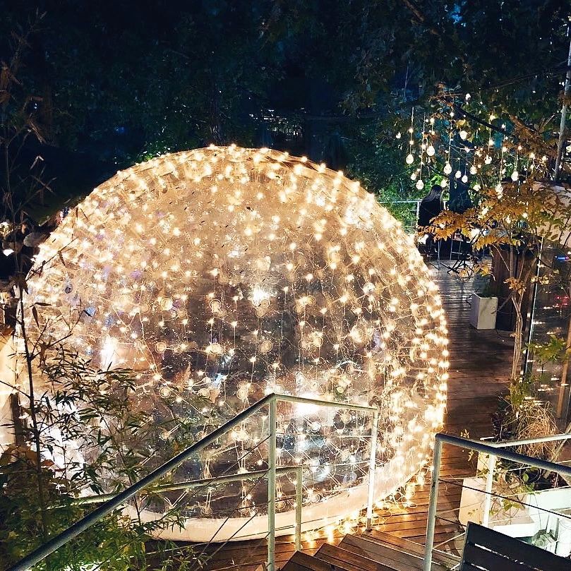 接下来去的就是将将。虽然将将不是夜店,但它比较适合晚上去浪。将将的二楼有一个室外区,那里摆着一个个气球包厢。夜幕低垂时,这些包厢星星点点的灯亮起,坐在里面就好像漂浮在璀璨的外太空。现在时值秋冬,将将的气球包厢里面都有暖风机,而且还配给毛毯,怕冷的仙女也不用担心了。