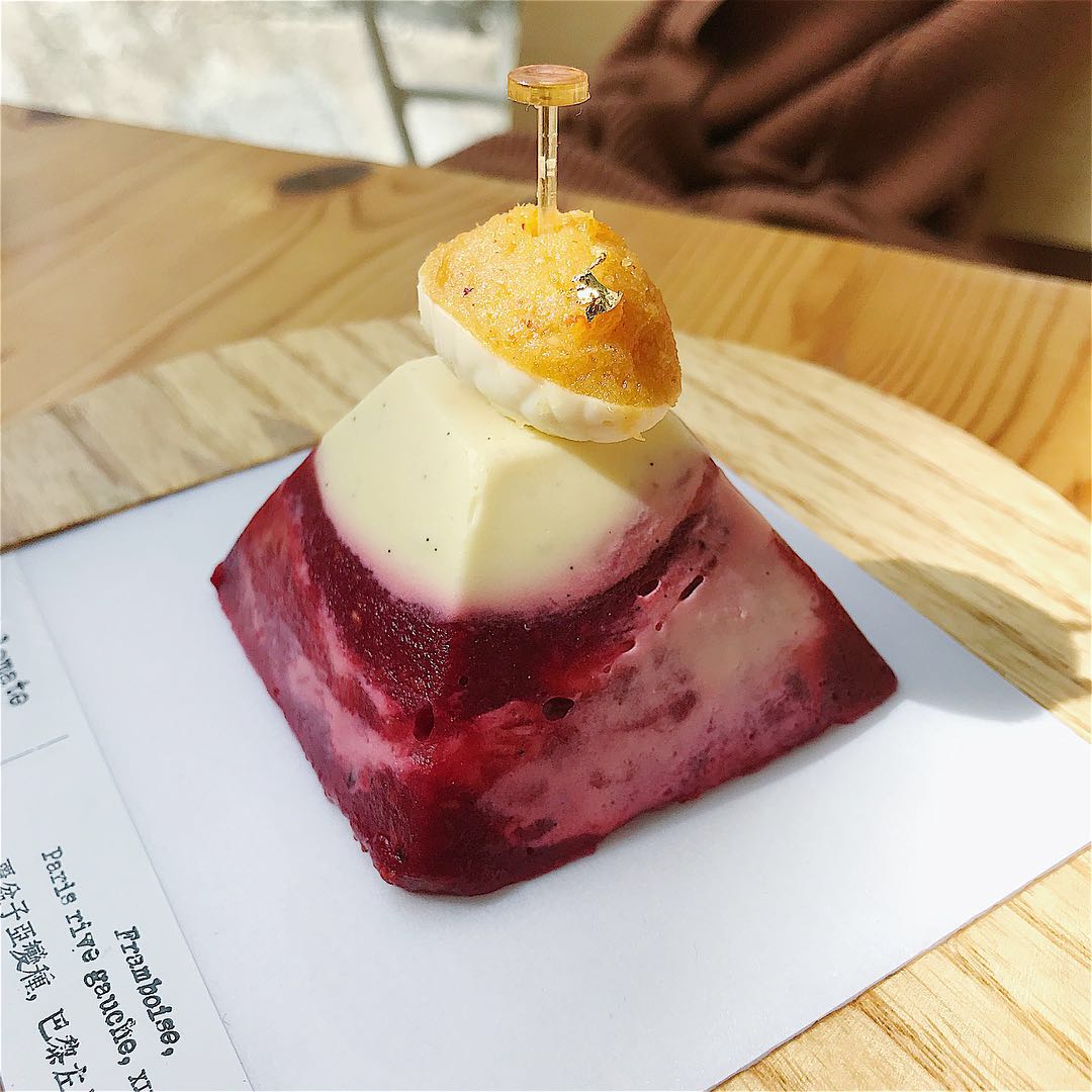 在风卷残云完两个甜点后,我又不知悔改地追加了第三个。下图这个甜点叫覆盆子外交官,上面是白巧克力包裹着微酸的陈皮。最惊喜的是里面还有跳跳糖,整个口感非常迷醉。下面则是覆盆子与芝士的结合,覆盆子的酸正好消解了芝士的腻。