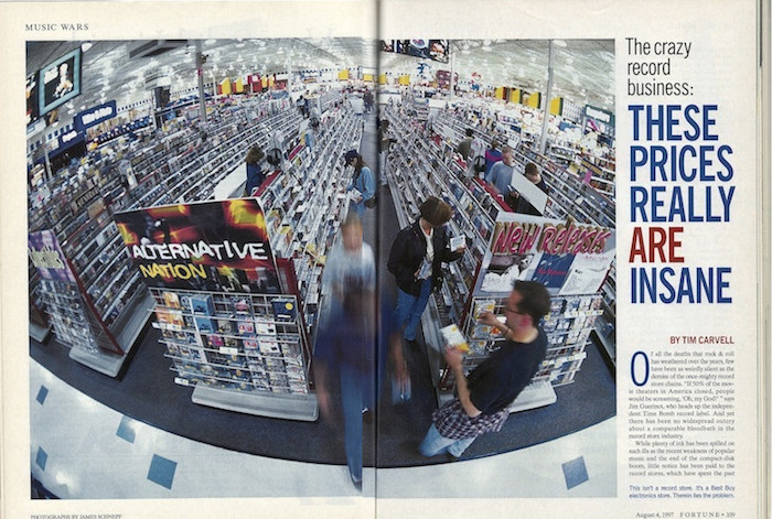 在 CD时代百思买成了赢家,但数码音乐时代也在它最成功的时候到来。美国的音乐销售在1998年前后达到了半个世纪以来的巅峰。巅峰之后,在十年里,音乐销售量就下降到了1960年代的水平,而且主要以数码音乐为主。音乐行业里,分销商消失了,零售门店消失了,音乐的载体也消失了。