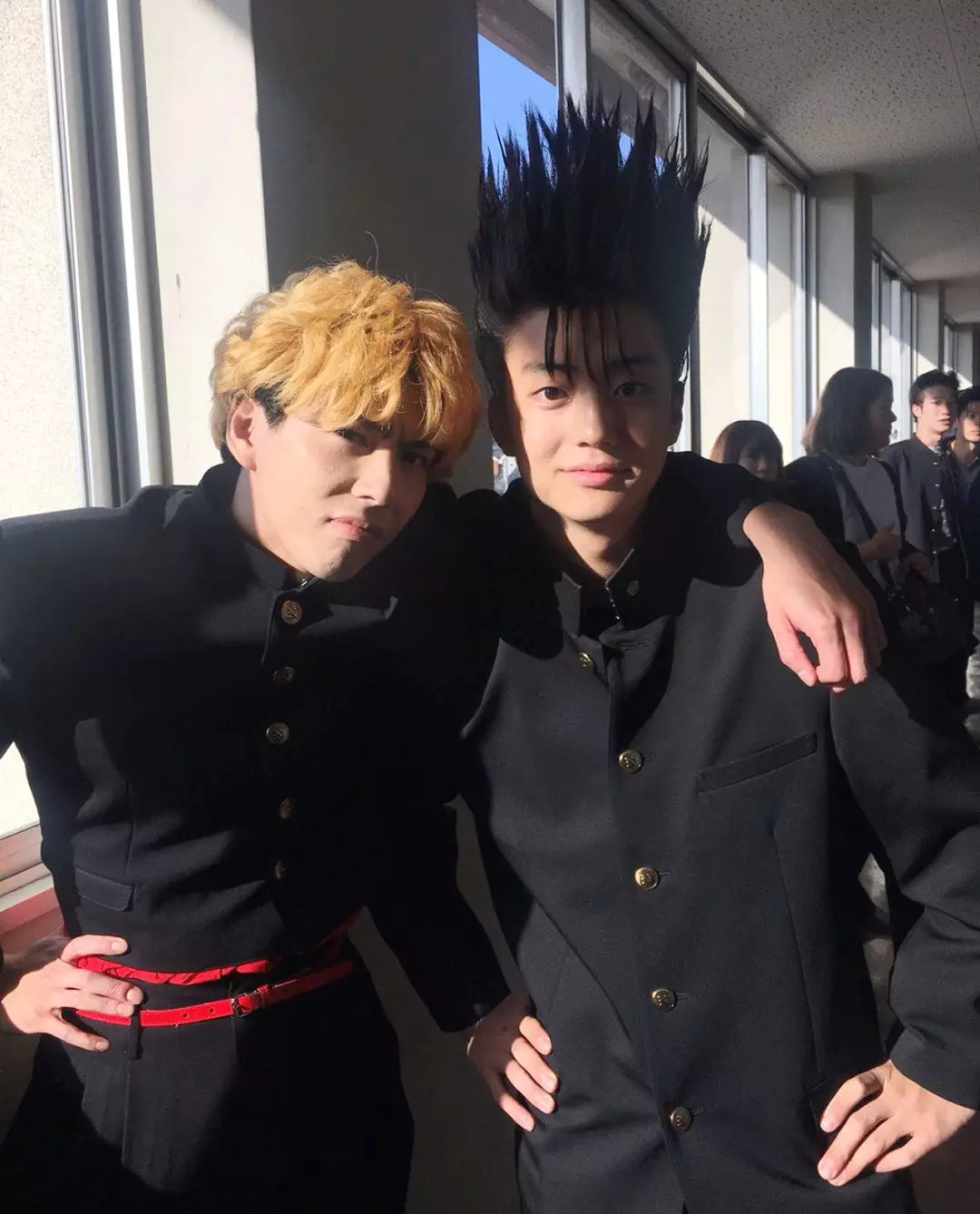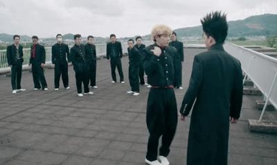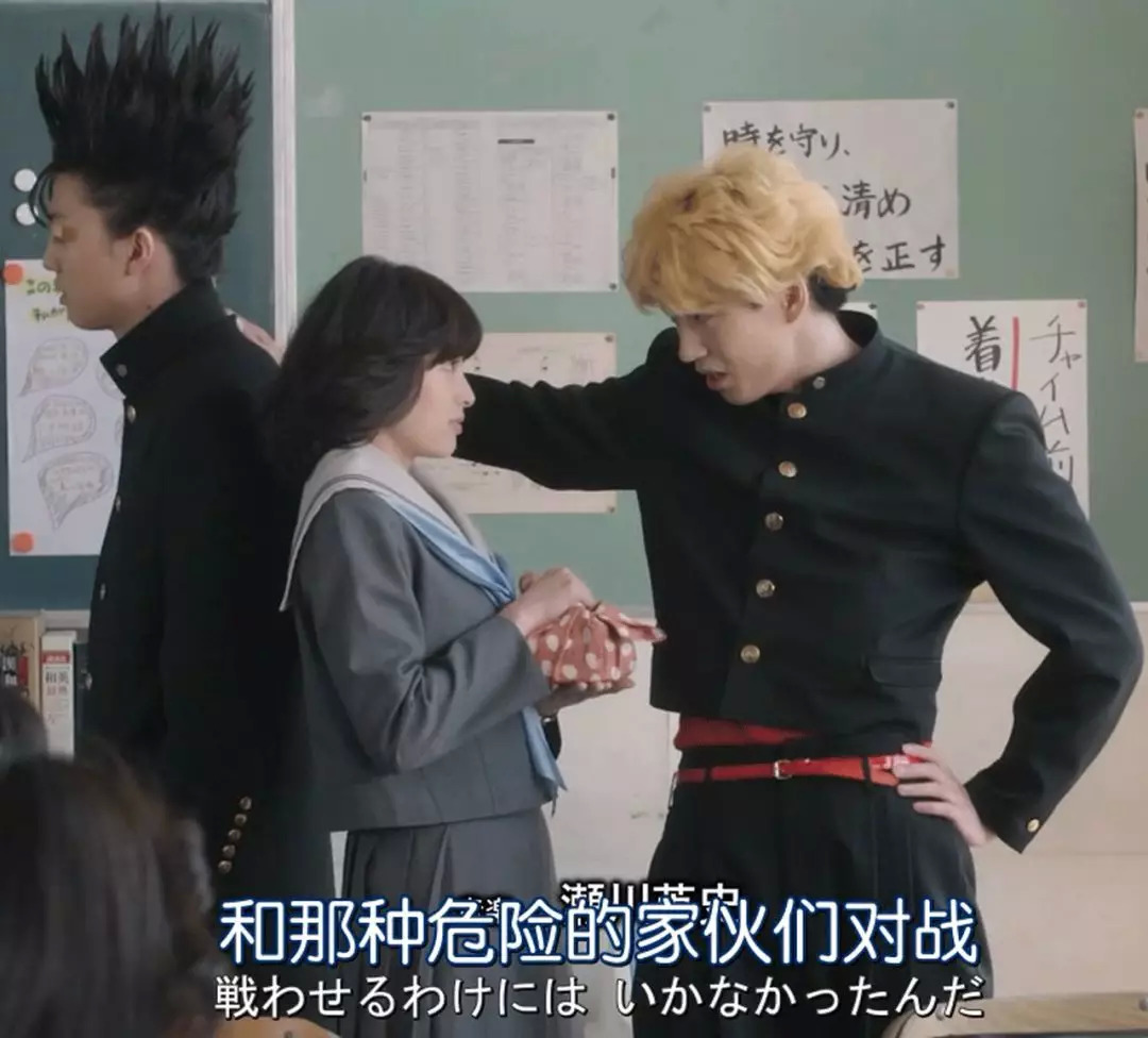 因为不良少年都还是学生,所以穿的也是校服。那怎么跟好学生区别开呢?自己改呗。男主就把制服改短,收了腰身,还要加个了酷炫的红皮带。